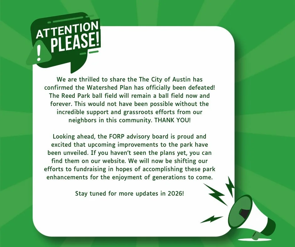 Friends of Reed Park is a volunteer-led nonprofit dedicated to preserving, enhancing, and celebrating one of Austin’s most beloved neighborhood parks.